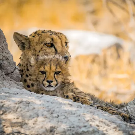 Today you will be treated to an exciting morning guided game drive into the Etosha National Park, to see more of the wide variety of game and bird species that are to be found there. There is then time to relax by the refreshing swimming pool before you head out again for an afternoon game drive into Etosha before exiting the park before sunset. Alternatively, you can opt to spend the whole day out in the park and either take lunch by one of the other rest camps in the area or have a picnic while watching a game at a particularly productive waterhole in the area. Once you are back (gates close at sunset), the rest of the evening can be spent game viewing at the camp's floodlit waterhole while enjoying dinner, and afterwards. Etosha National Park: Etosha National Park covers 22,270 sq km, of which approximately 5,000 sq km is made up of saline depressions or 'pans'. The largest of these pans, the Etosha Pan, can be classified as a saline desert in its own right. The Etosha Pan lies in the Owambo Basin, on the north-western edge of the Namibian Kalahari Desert. Until three million years ago it formed part of huge, shallow lake that was reduced to a complex of salt pans when the major river that fed it, the Kunene, changed course and began to flow to the Atlantic instead. If the lake existed today, it would be the third largest in the world. Etosha is the largest of the pans at 4,760 k sq km in extent. It is nowadays filled with water only when sufficient rain falls to the north in Angola, inducing floods to flow southward along the Cuvelai drainage system. The Park consists of grassland, woodland and savannah. Game-viewing centers around the numerous springs and waterholes where several different species can often be seen at one time. The Park boasts some 114 mammal and over 340 bird species. Wildlife that one might see includes elephant, lion, giraffe, blue wildebeest, eland, kudu, gemsbok (oryx), zebra, rhino, cheetah, leopard, hyena, honey badger and warthog, as well as the endemic black faced impala.