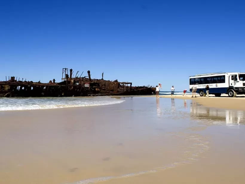 Beginning in Brisbane, you’ll head north to K’gari (Fraser Island), where rainforest meets beach and freshwater lakes shimmer beneath the canopy. A guided 4WD tour reveals the island’s remote beauty, from the mirror-like waters of Lake McKenzie to the rusted wreck of the Maheno.
