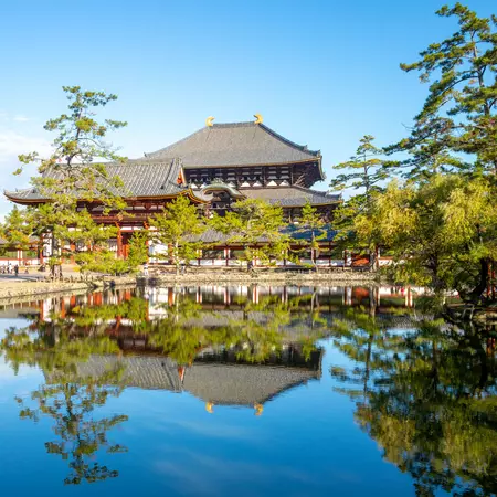 Take a full day tour to explore some of Kyoto and Nara's most famous sites. Visit Nijo Castle, noted for its gorgeous interiors and its 'squeaky' nightingale floors which alerted residents to unwanted intruders (if Nijo Castle is closed, visit Ryoanji Temple instead). Continue to Kinkakuji Temple, famous for its Golden Pavilion covered entirely in thin layers of pure gold as well as for its exquisite Japanese gardens and koi ponds. Afterwards, visit Kyoto's Imperial Palace and gain exclusive access to the former residence of the Emperor of Japan (if the Palace is closed, visit Kitano Tenmangu Shrine instead). After a western-style lunch, travel by bus to Nara, the first permanent capital of Japan. Visit the ancient Todaiji Temple and its massive Great Buddha (the largest bronze Buddha in Japan). You will also see the colorful Kasuga Taisha Shrine with 3,000 lanterns. This Shinto shrine is considered one of Japan's "Three Great Shrines". Also visit Nara Park, affectionately called "Deer Park" because of the friendly, free-roaming deer that inhabit it. Return to Kyoto in the evening.